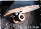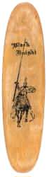 The Black Knight Logo is in fairly good shape. Please click photo above to view the full size scan of the board to see the top deck accurately. The finish appears to be bare wood on the underneath, with Protective varnish on top which is weathered or worn thin to almost bare wood in some places. The board itself is structurally sound. A small crack is visible on the bottom wood layer upon close inspection, but it does not go beyond that layer. The trucks are in good condition, as are the rubber bushings, and all bearings are present and wheels spin fine. A small amount of rust is on the surface of Main Truck bolts. This board has not been restored.