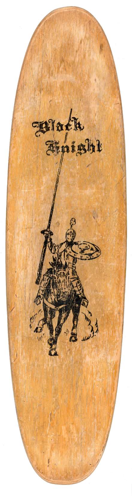 The vintage "Black Knight" skateboard featured here was a 60's production item, with featured Black Knight graphics upon its multi-layered laminated wood deck with clay type wheels.