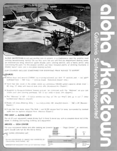 ALOHA SKATETOWN is not just another pile of cement. It is California's (and the world's) most exciting skateboarding facility! On our four-acre hill you will find six magnificent skating areas, an extensive pro shop, electronic game arcade, patio viewing section, and a family picnic area overlooking the park. For the skaters' comfort, we have included plenty of drinking fountains, a shaded launch area, and a non-glare skating surface.
